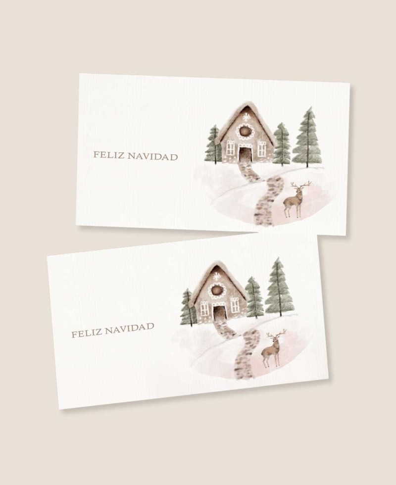 GeschenkverpackungDekorativer rechteckiger Aufkleber mit einer schönen Illustration einer Weihnachtslandschaft, inspiriert vom Geist der Weihnacht. Ein Bild mit einer Hütte, die von Tannen und Rentieren umgeben ist, das das perfekte Accessoire ist, um Ihre Details zu Weihnachten zu dekorieren.