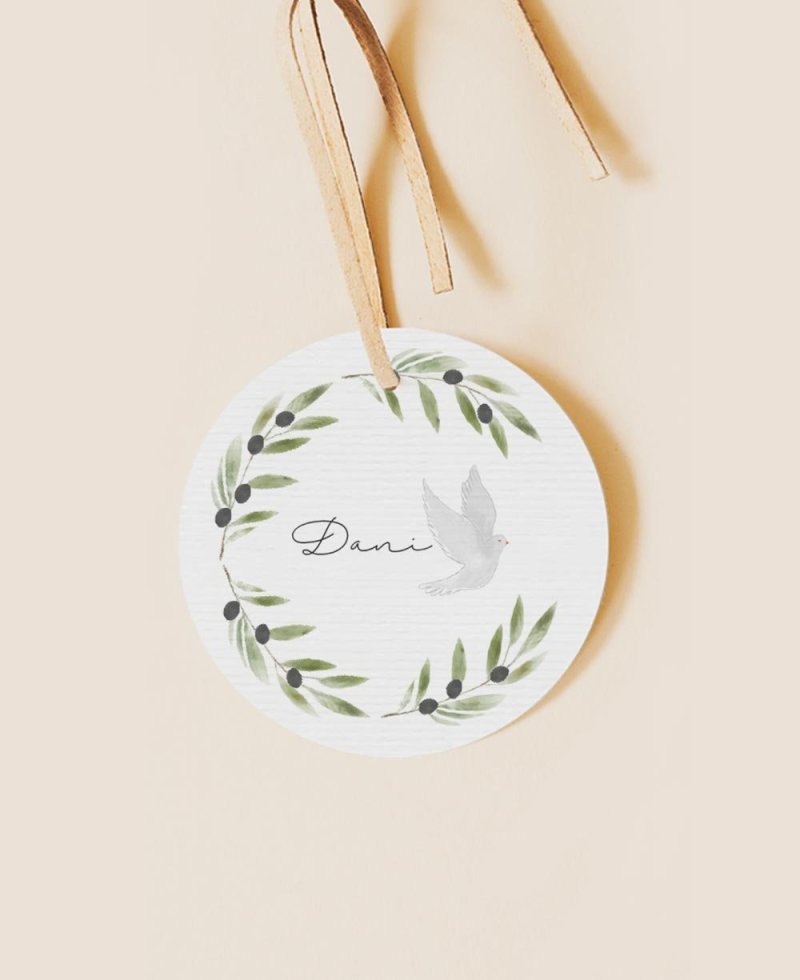Rundes Kommunionetikett , verziert mit einem schönen floralen Olivenkranz und einer zarten Taube. Die Papeterie-Details für den Tag der Feier, die Sie und Ihr Kind lieben werden .