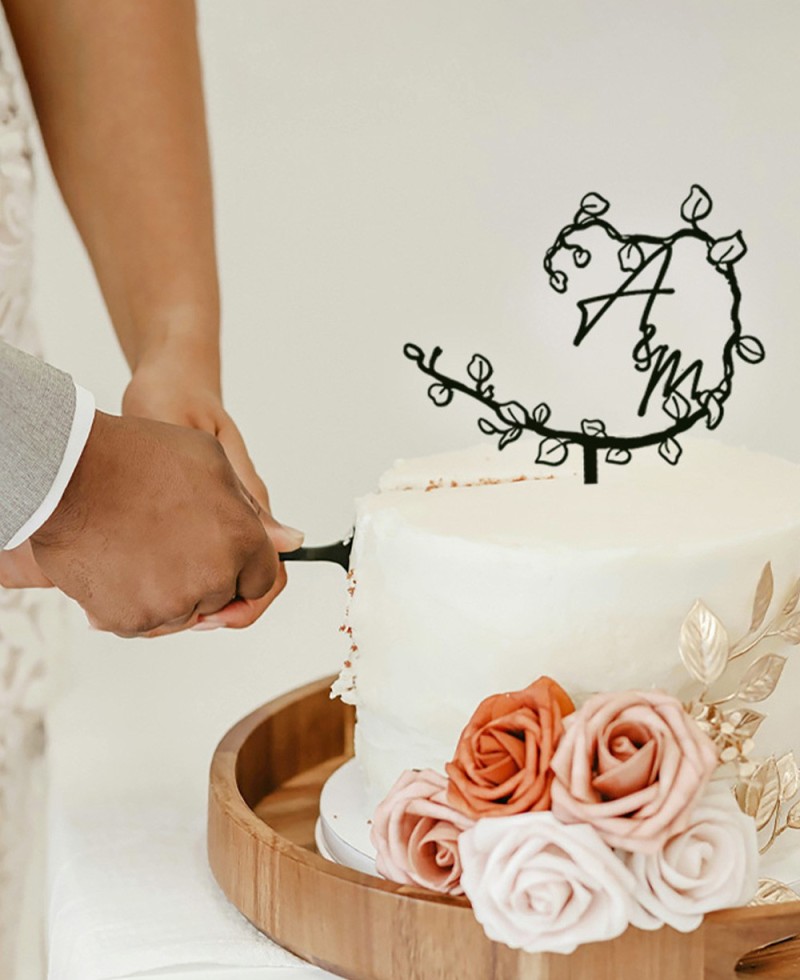 Cake topper personalizable con las iniciales que desees y decorado con una sinuosa rama de romero.