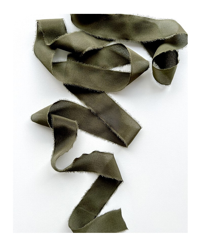 Si buscas cinta de seda natural de color verde oscuro, entre verde militar y un medio tono caqui con los bordes deshilachados de la más alta calidad, no lo dudes, estos lazos de seda te enamorarán.