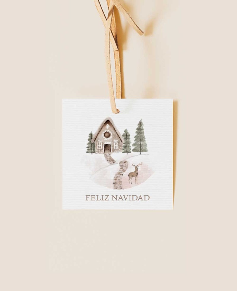 EtiquetasEtiqueta cuadrada decorativa con una bonita ilustración de un paisaje navideño, inspirados en el espíritu de la Navidad. Una estampa con una cabaña rodeada por abetos y un reno que será el accesorio perfecto para decorar tus detalles estas Navidades.