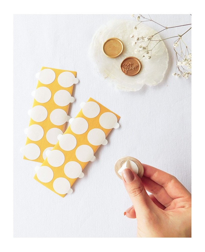 Uno de los accesorios estrella para tus sellos de lacre, con estas pegatinas autoadhesivas especiales, podrás colocar tus sellos de forma fija sobre la solapa de tus sobres o el papel de cualquier proyecto.