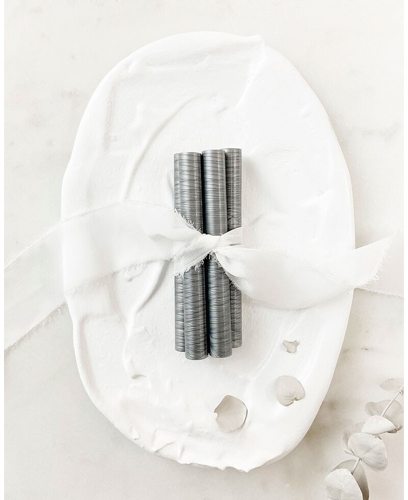 Barres d’étanchéitéLes barres de cire à cacheter en argent sont rehaussées de tons gris qui adoucissent et ajoutent de l’élégance, accompagnés de leurs reflets métalliques qui offrent tant de détails et de texture au sceau.