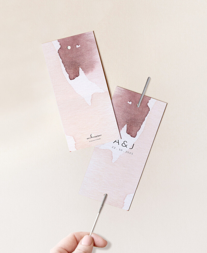 Porte-fusée personnalisé pour mariage. Décoré d’élégants coups de pinceau d’aquarelles dans des tons orangés, rappelant la couleur de l’argile et de la céramique. La papeterie parfaite pour votre cérémonie de mariage dans un style classique et naturel.