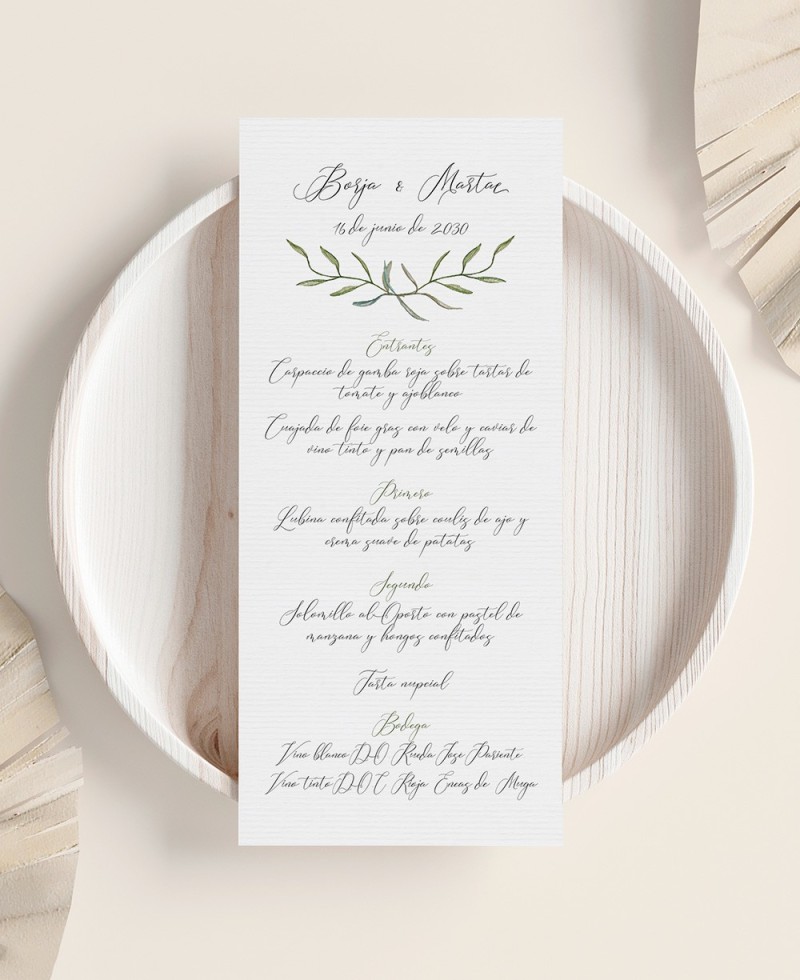 MinutesPersonalized wedding menu decorated with delicate and elegant olive bouquets in sallow tone. The perfect stationery for your nature-themed wedding party.