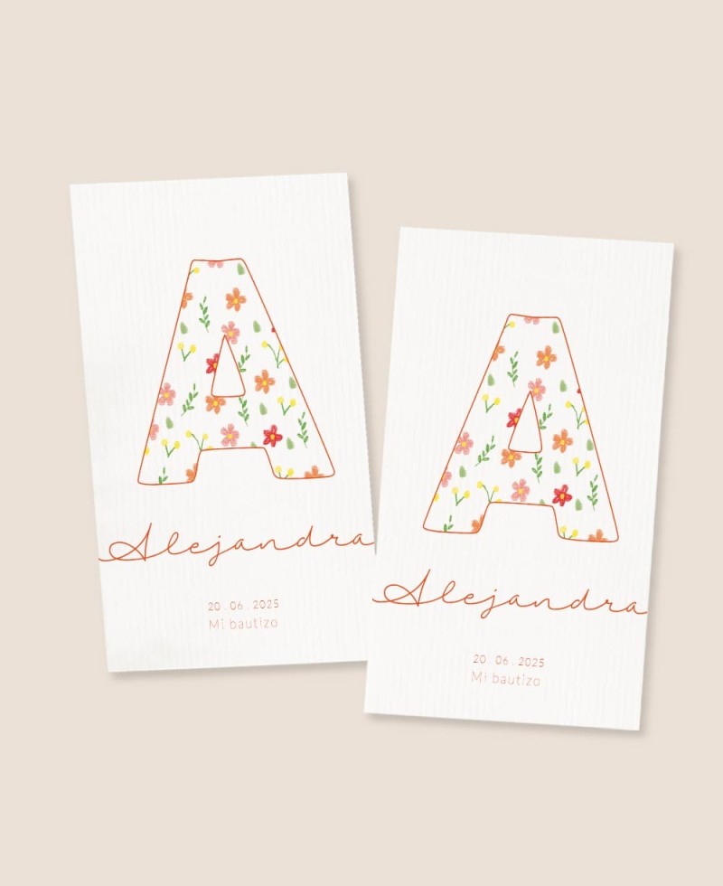 Adesivo battesimo rettangolare verticale decorato con l'iniziale del bambino e un'allegra stampa floreale. La cancelleria per bambini perfetta per la festa del battesimo del tuo bambino.