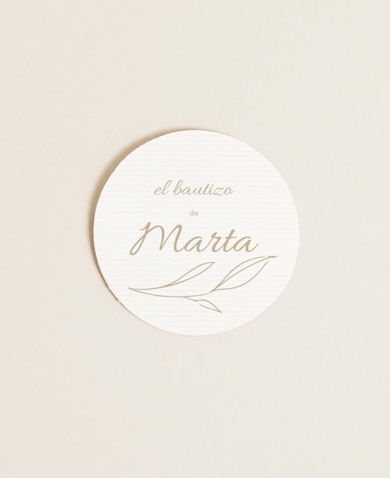 Adesivo battesimale rotondo minimalista , con un elegante mix tipografico nei toni del beige sabbia e un delicato ramo d'ulivo. La cancelleria per bambini perfetta per la festa del battesimo del tuo bambino.
