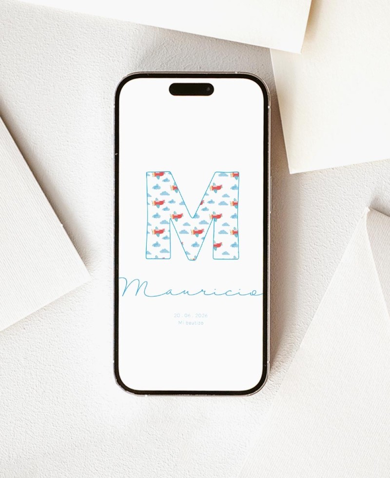 Invito al battesimo digitale personalizzato . Video animato ideale per l'invio ai tuoi contatti. Decorato con l'iniziale del bambino con una simpatica stampa di nuvole e aeroplanini giocattolo. Il modo perfetto per sostituire o completare i tuoi inviti iniziali al battesimo a tema.