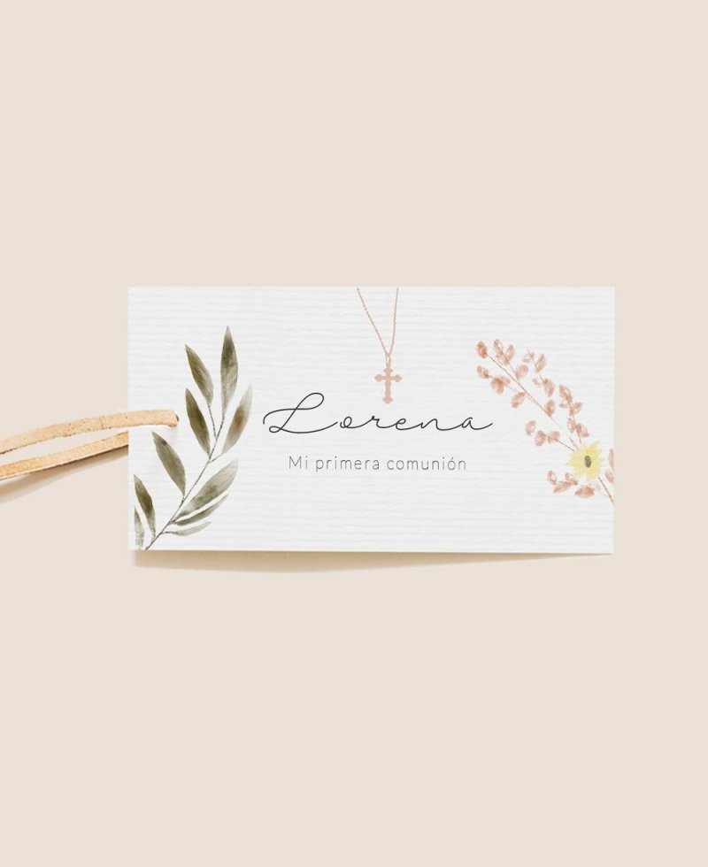 Etiqueta de comunhão retangular decorada com uma aguarela floral e um colar com uma cruz em tons naturais. Os detalhes de papelaria para o dia da celebração que você e seu filho vão adorar .